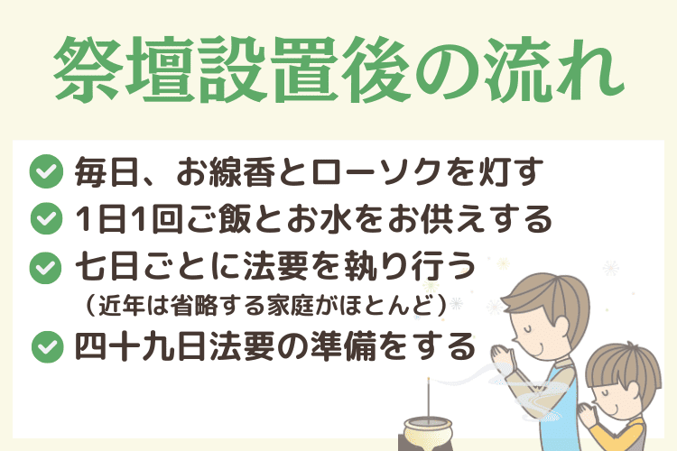 葬儀が終了したあとは、四十九日法要まで祭壇を設置して故人の冥福を祈ります。
