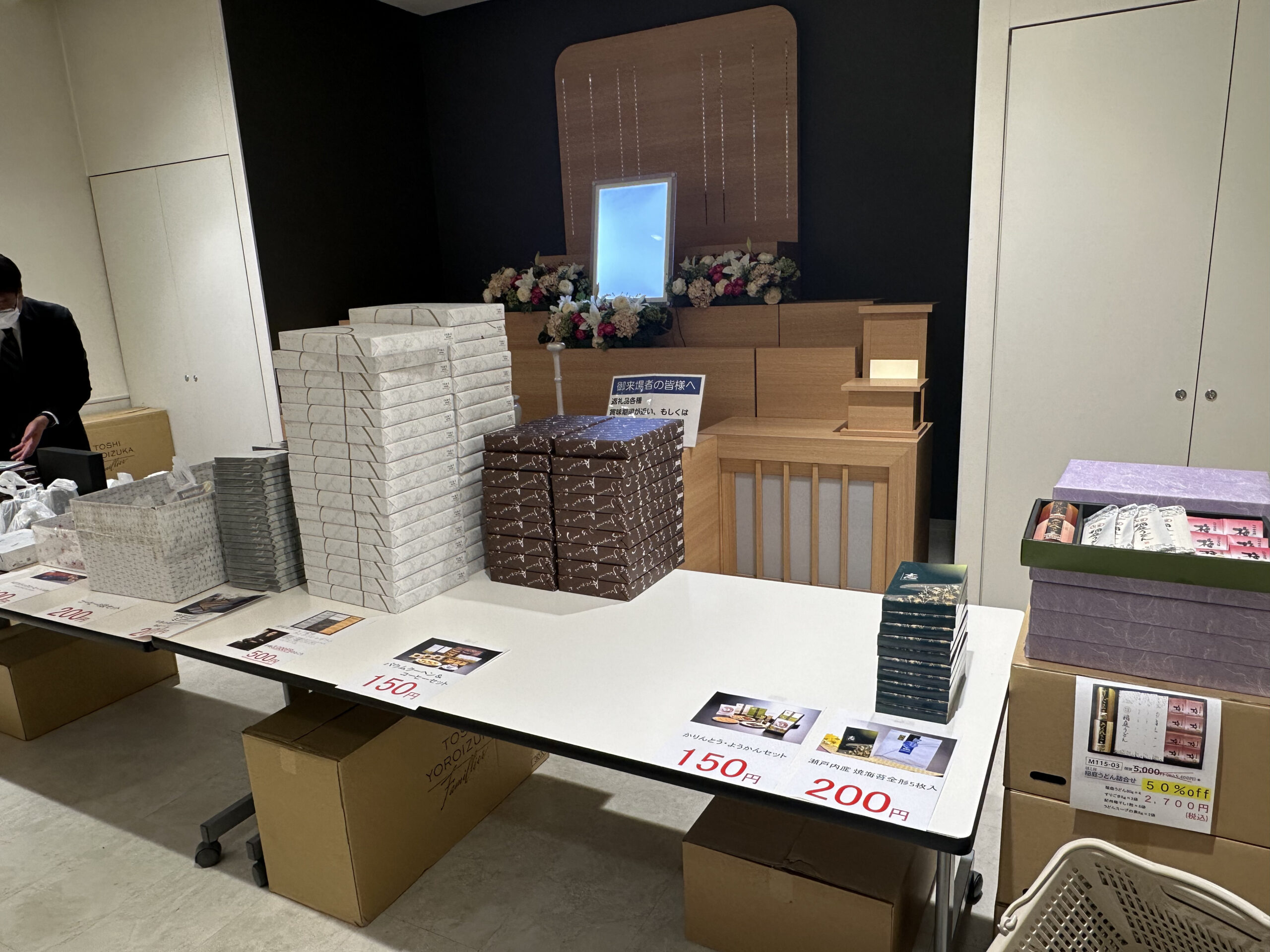 こちらではしんことに花マルシェのメインイベントである「フラワーアレンジメント教室」や軸花の格安での「お花の販売」、 さらには会葬品で使用される物が安く購入できる「会葬品訳あり市」などが展開されております!