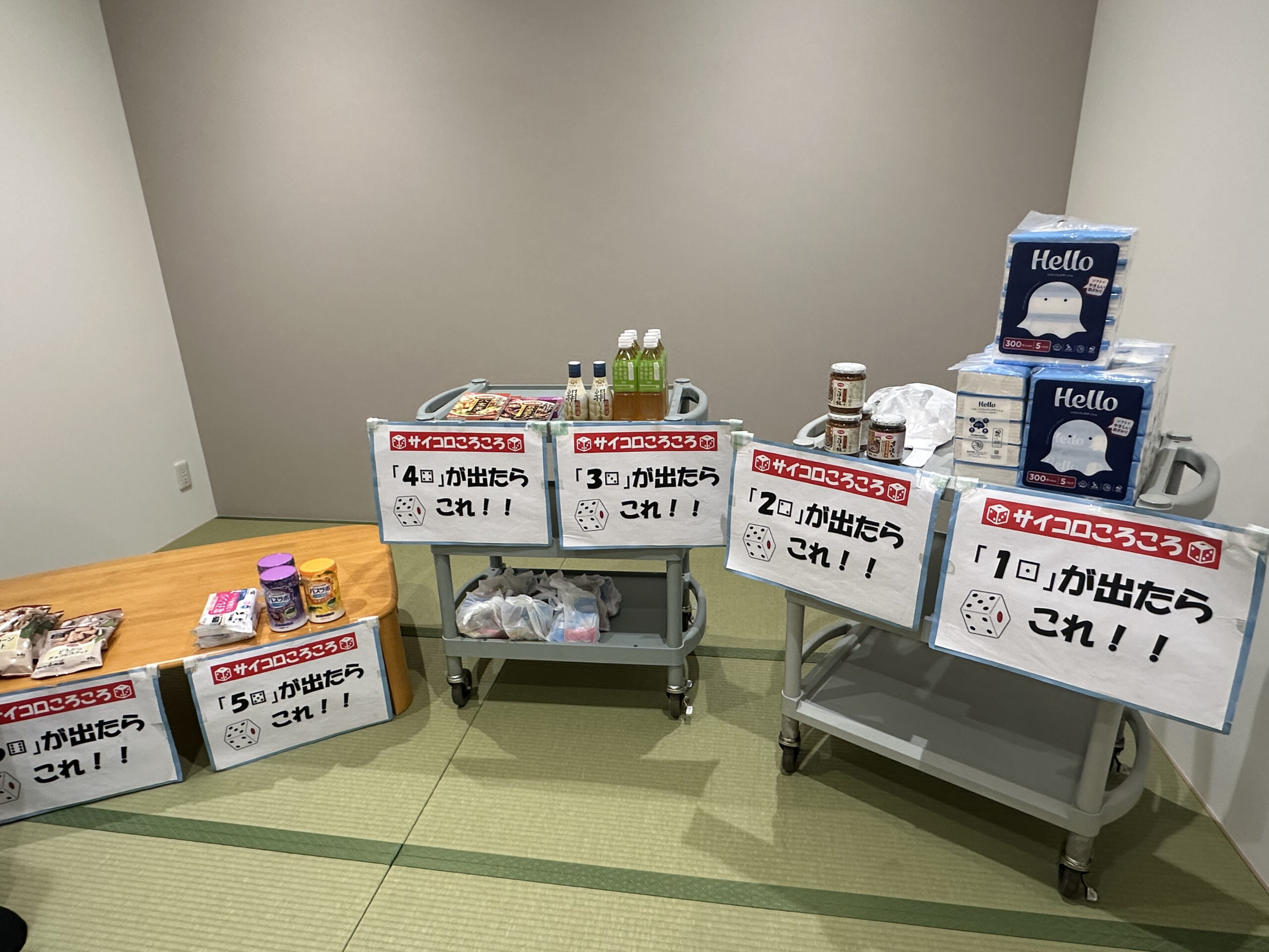 景品はティッシュやお醤油、入浴材など出た目によって対象商品を1つお持ち帰りいただけます!