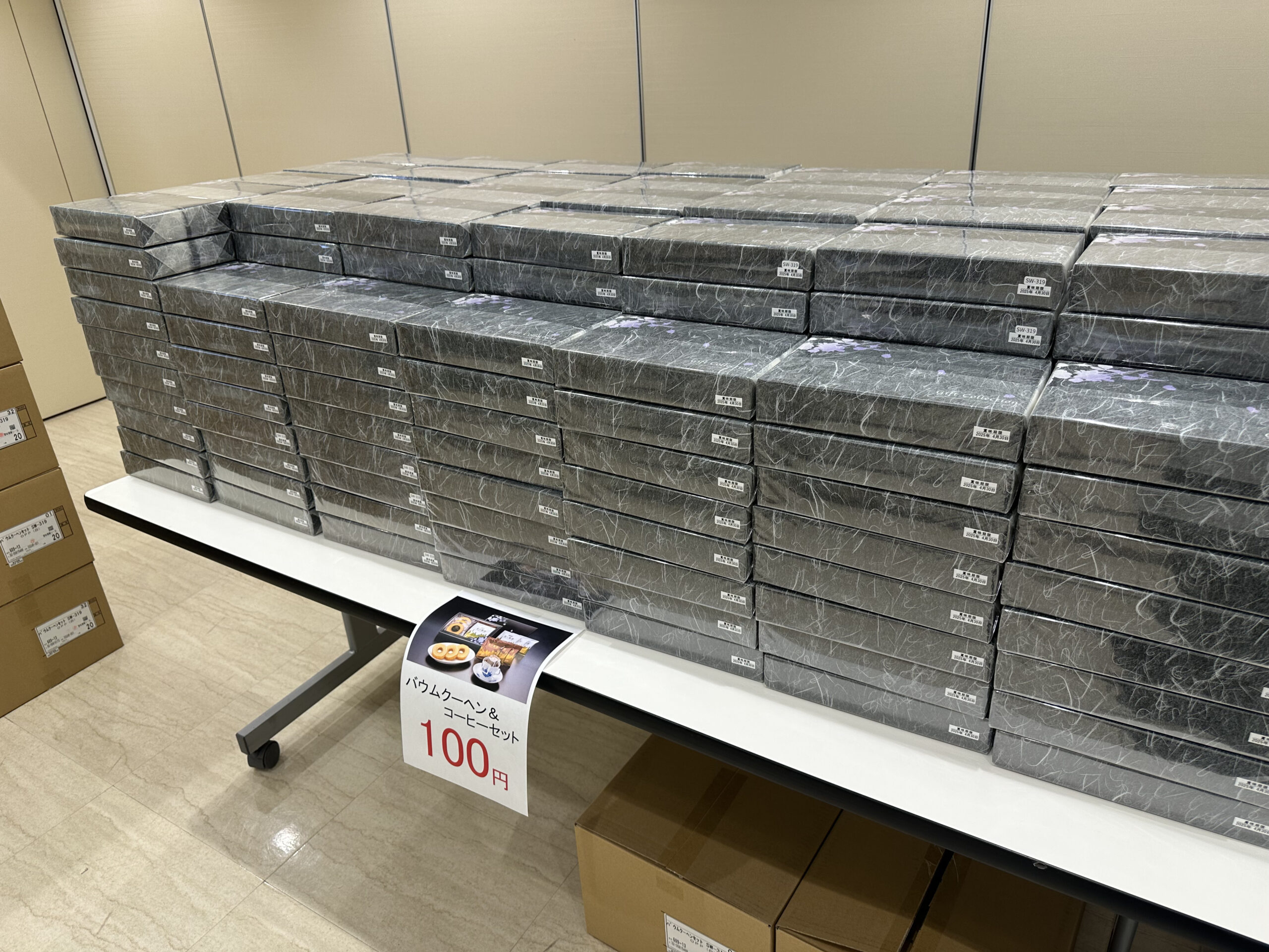 例えば,バームクーヘン✖️2個+スティック粉コーヒーがセットになっている箱が1つ100円!!!
